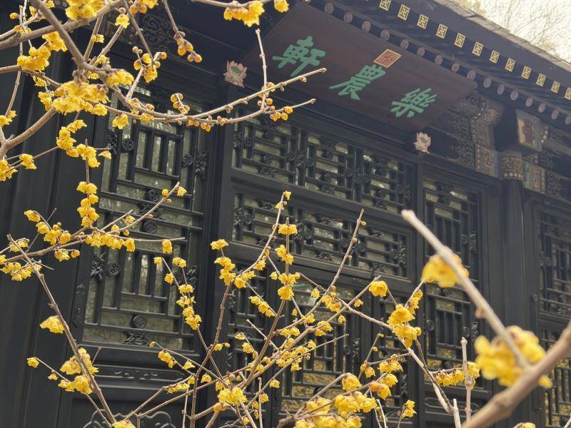 在颐和园乐农轩门前,青砖砌墙、石片盖顶的朴素屋舍前,一簇簇鹅黄色的蜡梅花缀满枝头,花量较往年明显增多。园林科技科科长赵晓燕介绍,这得益于今冬对蜡梅的精细养护,加上两场大雪为蜡梅补充了充足的水分,使得花开得格外繁盛。花瓣晶莹润泽,在春日暖阳的照耀下显得娇嫩欲滴。微风拂过,清甜醇厚的幽香萦绕鼻尖,沁人心脾,吸引了大量游客驻足拍照,已然成为园内眼下最热门的“打卡地”。