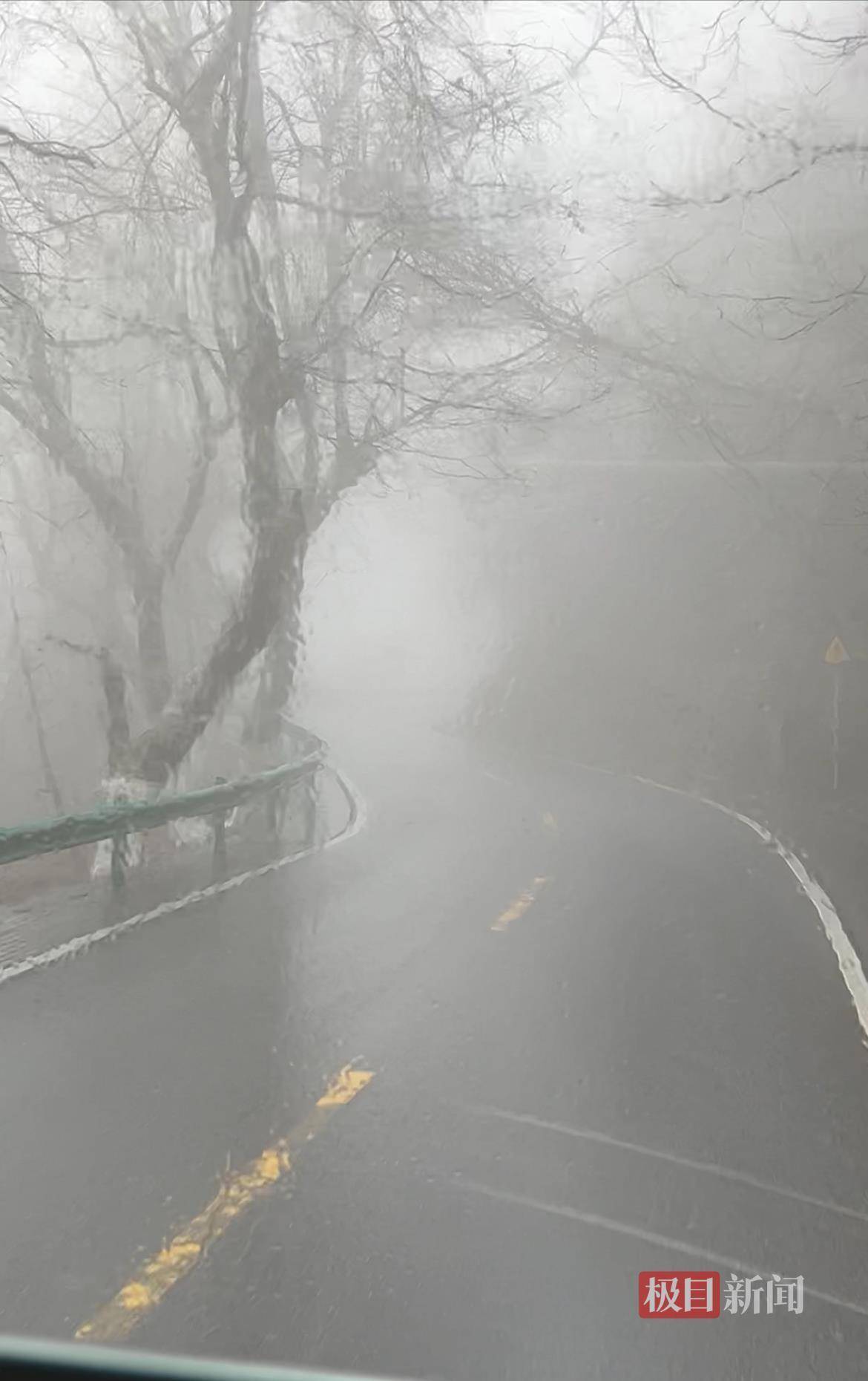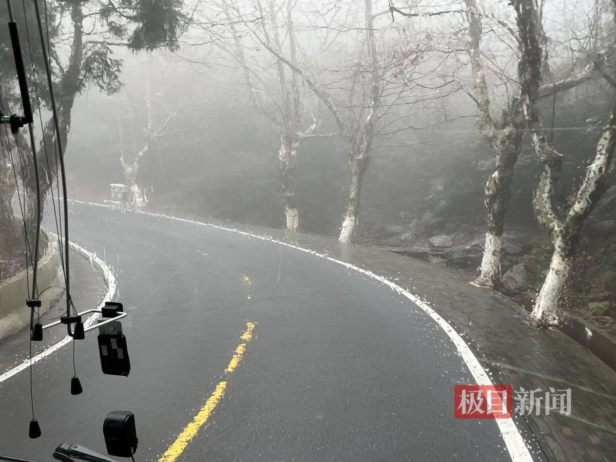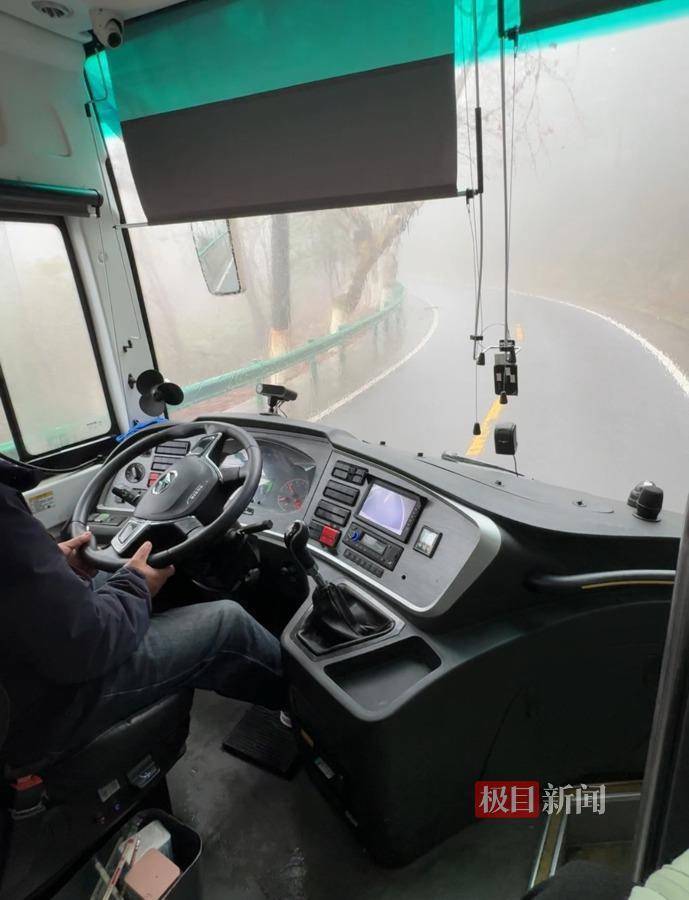 司机张师傅冷静从容地操纵着观光车,平稳驶过多个连续弯道。刚上山时,尽管下着雨,游客的视线并未受太大影响。随着观光车行驶至半山腰,车外雾气渐浓,视线开始受限。道路一侧依山,一侧则是云雾茫茫的悬崖,但张师傅依旧从容不迫,熟练会车、精准过弯,全程稳如平地。