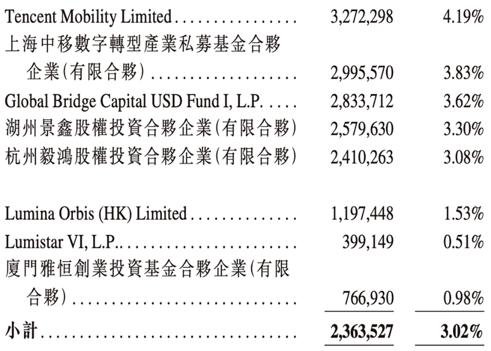 腾讯旗下Tencent Mobility Limited、中国移动旗下上海中移基金分别持股4.19%、3.83%。